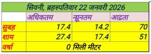 सिवनी (साई)। सिवनी जिले में आज ब्रहस्पतिवार 22 जनवरी 2026 की शाम तक रिकार्ड किया गया पिछले 24 घंटों का तापमान इस प्रकार रहा . . .