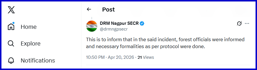 рдЗрд╕рдХреЗ рдмрд╛рдж рдЬрдм рдирд╛рдЧрдкреБрд░ рд╡рди рдордгреНрдбрд▓ рдХреА рдЕрдзрд┐рдХрд╛рд░реА рд╡рд┐рдиреАрддрд╛ рд╡реНрдпрд╛рд╕ рд╕реЗ рд╕рдВрдкрд░реНрдХ рдХрд┐рдпрд╛ рдЧрдпрд╛ рддреЛ рдЙрдирдХреЗ рджреНрд╡рд╛рд░рд╛ 20 рдЕрдкреНрд░реИрд▓ 2026 рдХреЛ рдЗрд╕ рддрд░рд╣ рдХреА рдХрд┐рд╕реА рднреА рдзрдЯрдирд╛ рдХреА рдЬрд╛рдирдХрд╛рд░реА рд╣реЛрдиреЗ рд╕реЗ рдЗрдВрдХрд╛рд░ рдХрд┐рдпрд╛ рдЧрдпрд╛ред